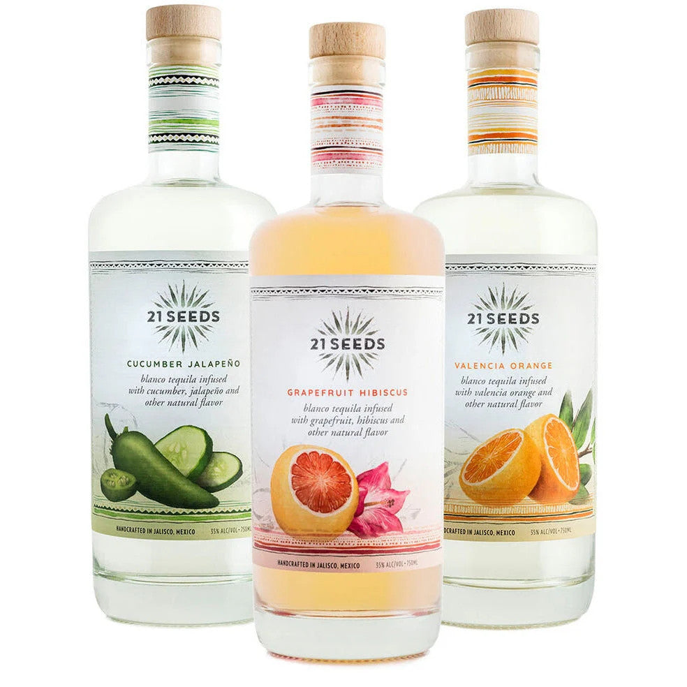 Includes: One (750ml) bottle of 21 Seeds Cucumber Jalapeño, one (750ml) bottle of 21 Seeds Grapefruit Hibiscus, and one (750ml) bottle of 21 Seeds Valencia Orange.