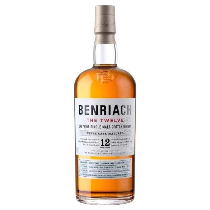 To make Benriach Twelve, Benriach spirit is three cask matured for at least twelve years in sherry casks, bourbon barrels and port casks. The whisky from each cask is then expertly married together to create a smooth, sherry-rich single malt, layered with baked fruit, maple honey and cocoa, perfectly balanced with a lingering sultana and spiced mocha finish.