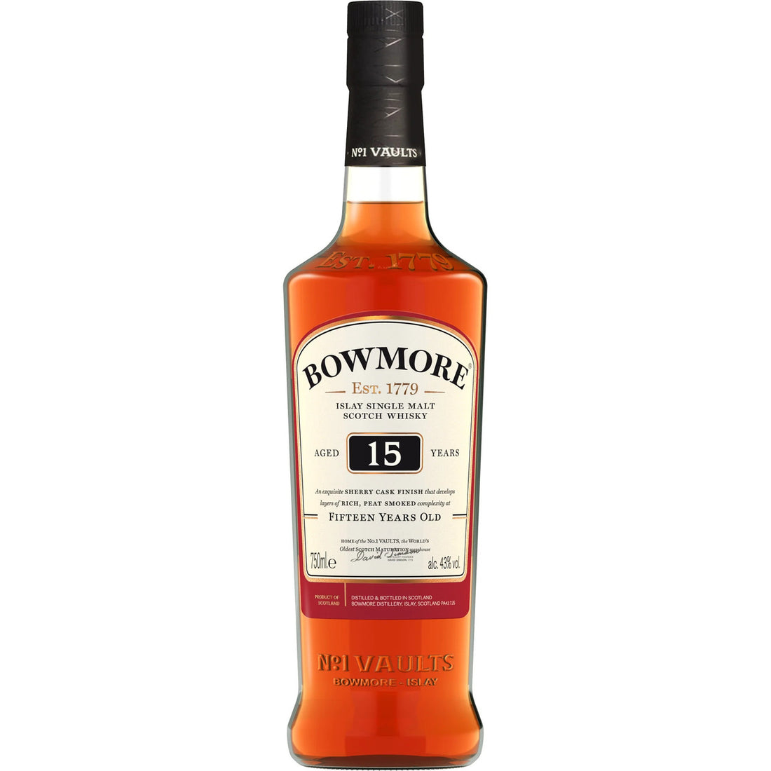 Founded in Islay in 1779, Bowmore is the home of the world's oldest Scotch Maturation Warehouse, The Legendary No.1 Vaults. Matured in an inspired combination of both bourbon and sherry casks, it's the final three years spent in Oloroso sherry casks that gives Bowmore 15-Year-Old 'Darkest', one of the most beautifully balanced Bowmores, the rich, deep color reflected in its name, and its warming finish.