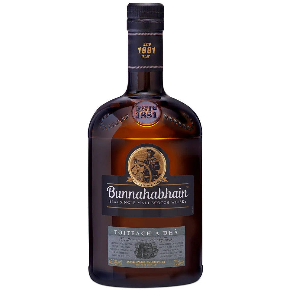 Toiteach A Dhí (pronounced Toch-ach ah-ghaa, meaning ‘Smoky Two' in Scots Gaelic) is a sequel to the original peaty paradox on Bunnahabhain'sgentle single malt, with a touch of smoke from our peated malted barley introduced during its creation and combined with a higher sherry influence.