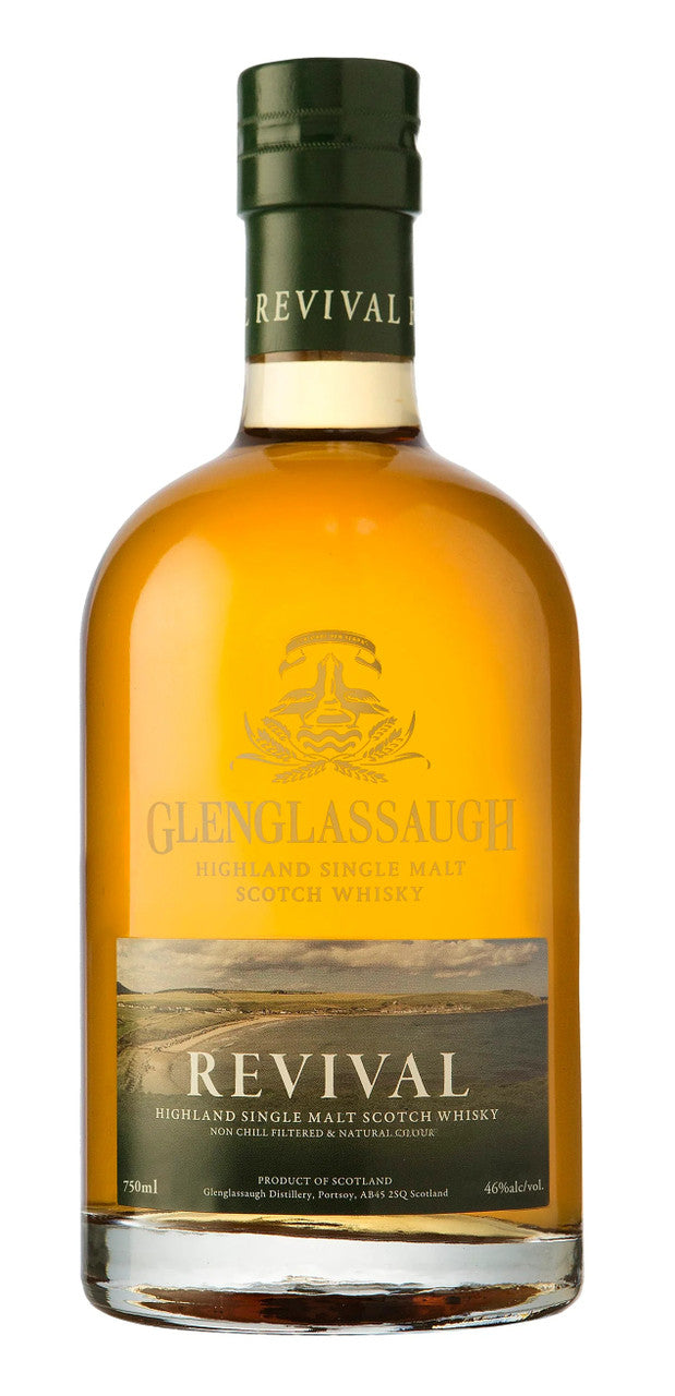 Glenglassaugh Revival has been matured in a balanced mix of red wine European oak casks and fresh Bourbon casks, vatted and re-racked for double maturation in rich sherry casks. This scotch whisky is non-chill filtered, natural color and bottled at 46%. Robust in style, sweet and fruity whilst rounded and creamy with perfect balancing sherry notes and a slight hint of sea-air.