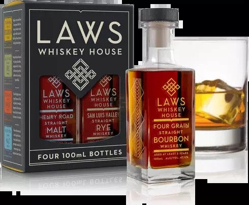 Four 100-ml bottles of Laws whiskey in one great package! Compare the Four Grain Straight Bourbon, the San Luis Valley Straight Rye, the Centennial Straight Wheat, and the Henry Road Straight Malt. or bring out the selection around to entertain friends of diverging palates.