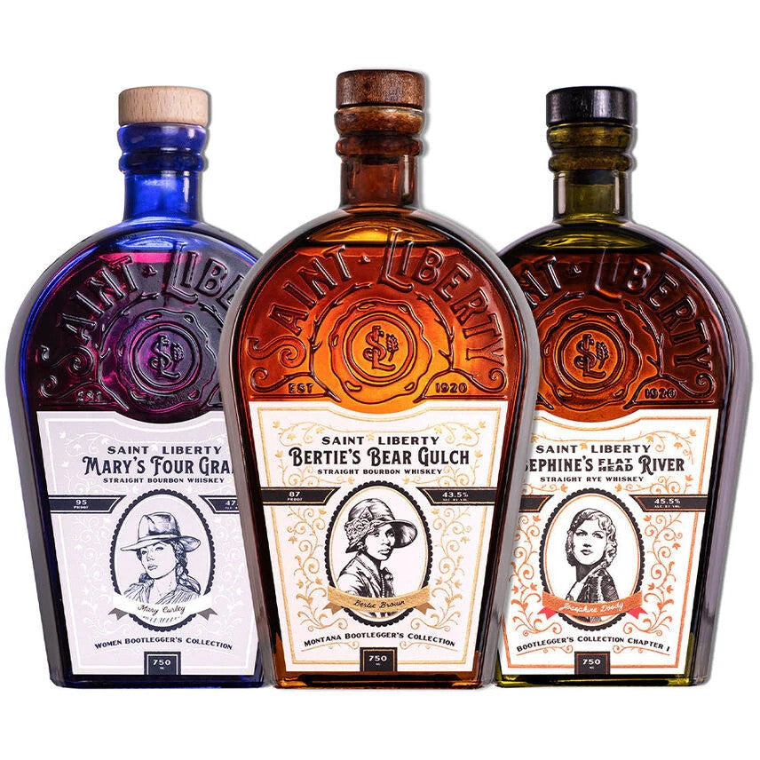 Includes: One (750ml) bottle of Bertie's Bear Gulch Bourbon Whiskey, one (750ml) bottle of Josephine's Flat Head River Rye Whiskey, and one (750ml) of Mary's Four Grain Bourbon Whiskey.